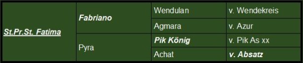 Fatimas Halbbruder Fo von Forrest xx erhielt in Verden das positive Körureil. Ebenso gekört wurde auch Mon Cher von Matcho AA. Mon Cher ist mittlerweile erfolgreich bis Grand Prix, sein Halbbruder Latops Finest ist erfolgreich in schweren Springen unterwegs. Weiterhin entstammen diese Mutterlinie u.a. gekörten Hengste wie Sandro Time und Lusitano und erfolgreiche Sportpferde wie Aljoscha oder auch Florestino.